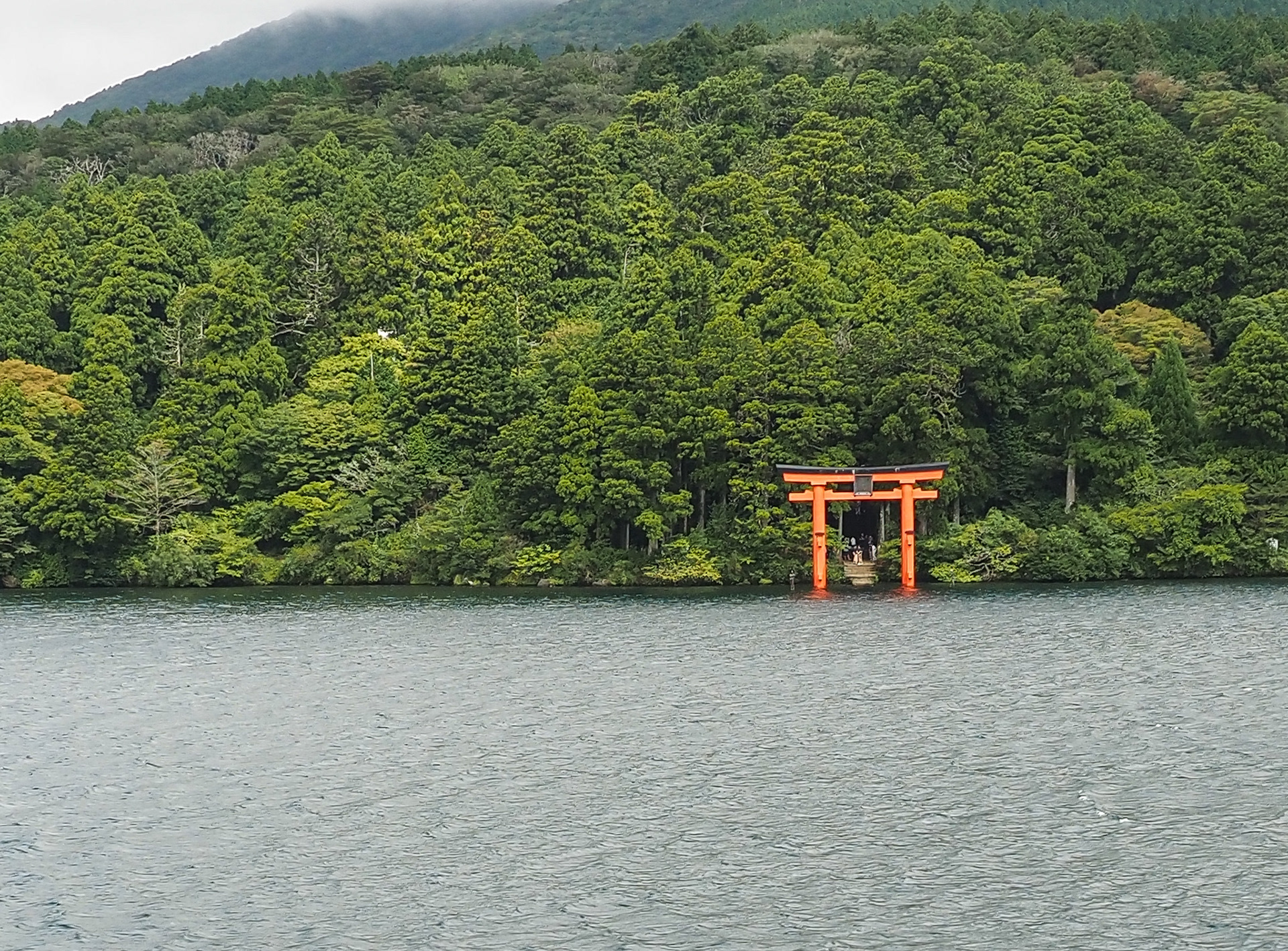 Shinto sacred arch as entry to forest on Lake Ashi